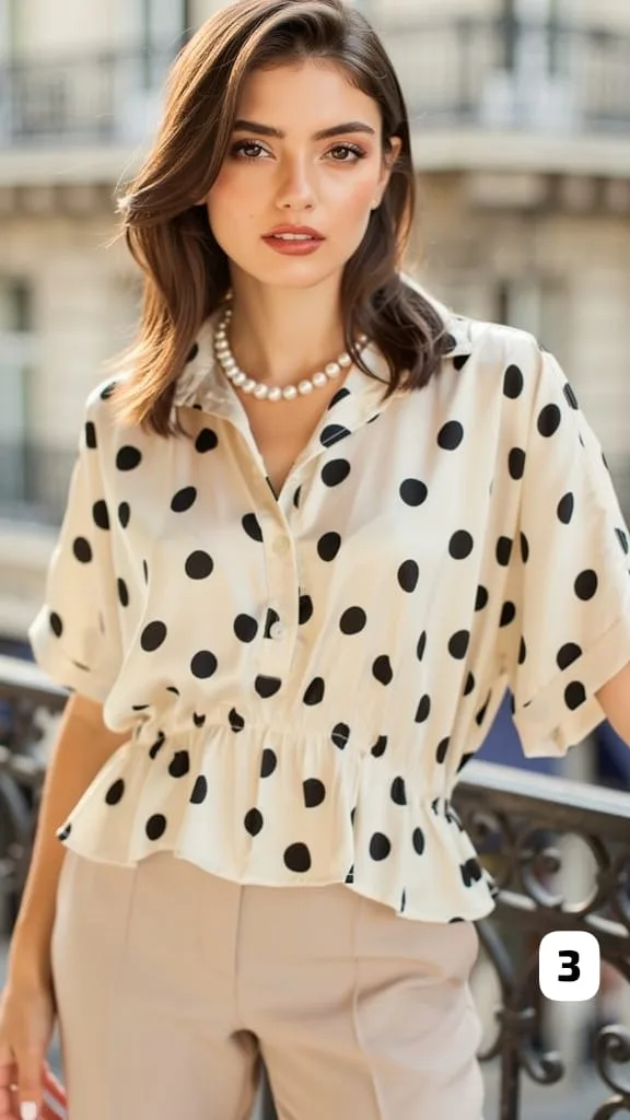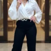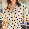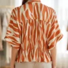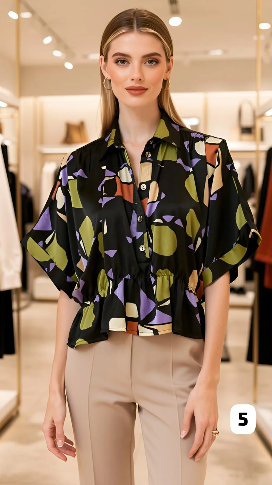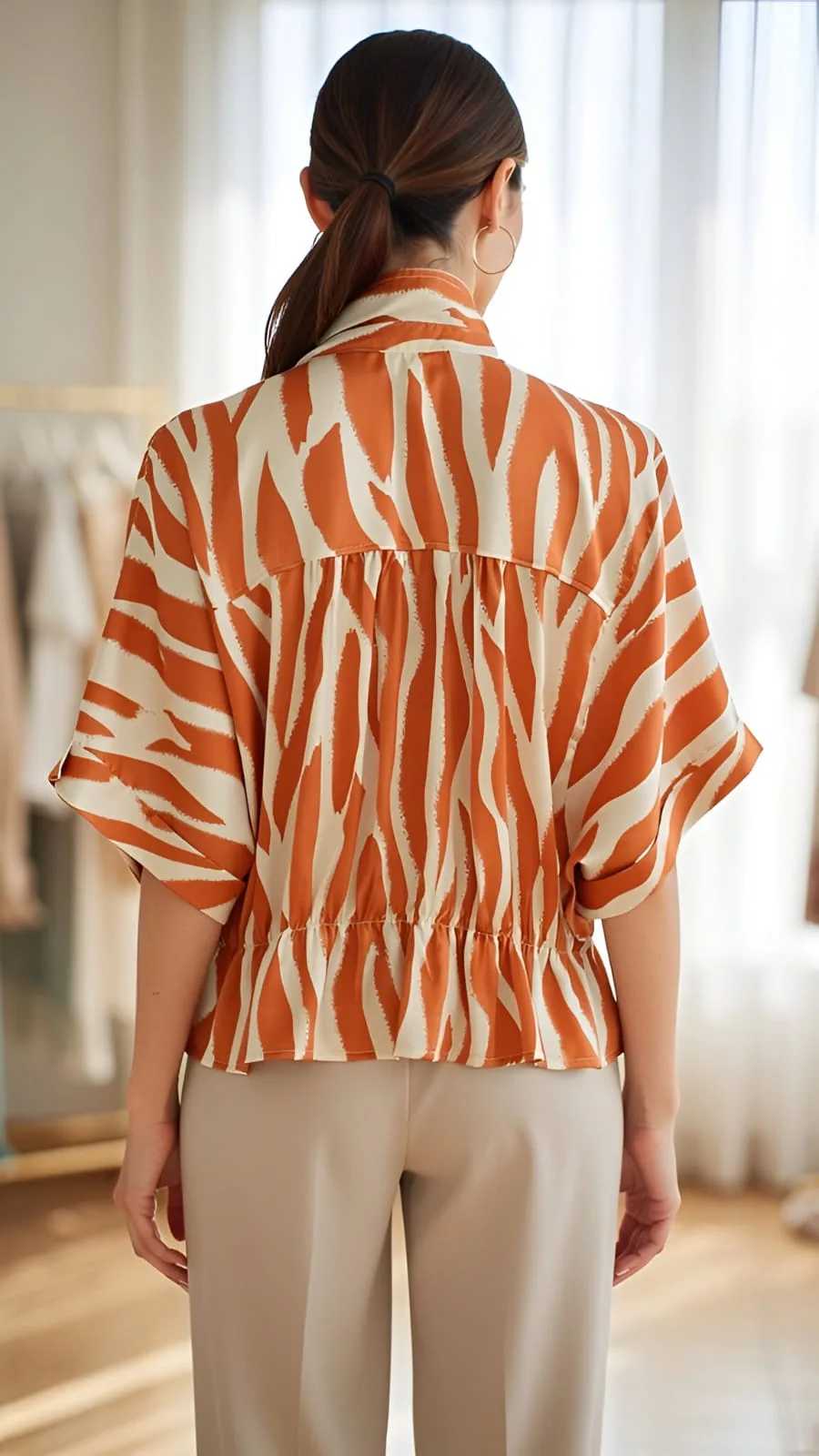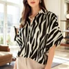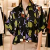Blusa con cuello manga doblada arrugada abajo de saten estampada melisa